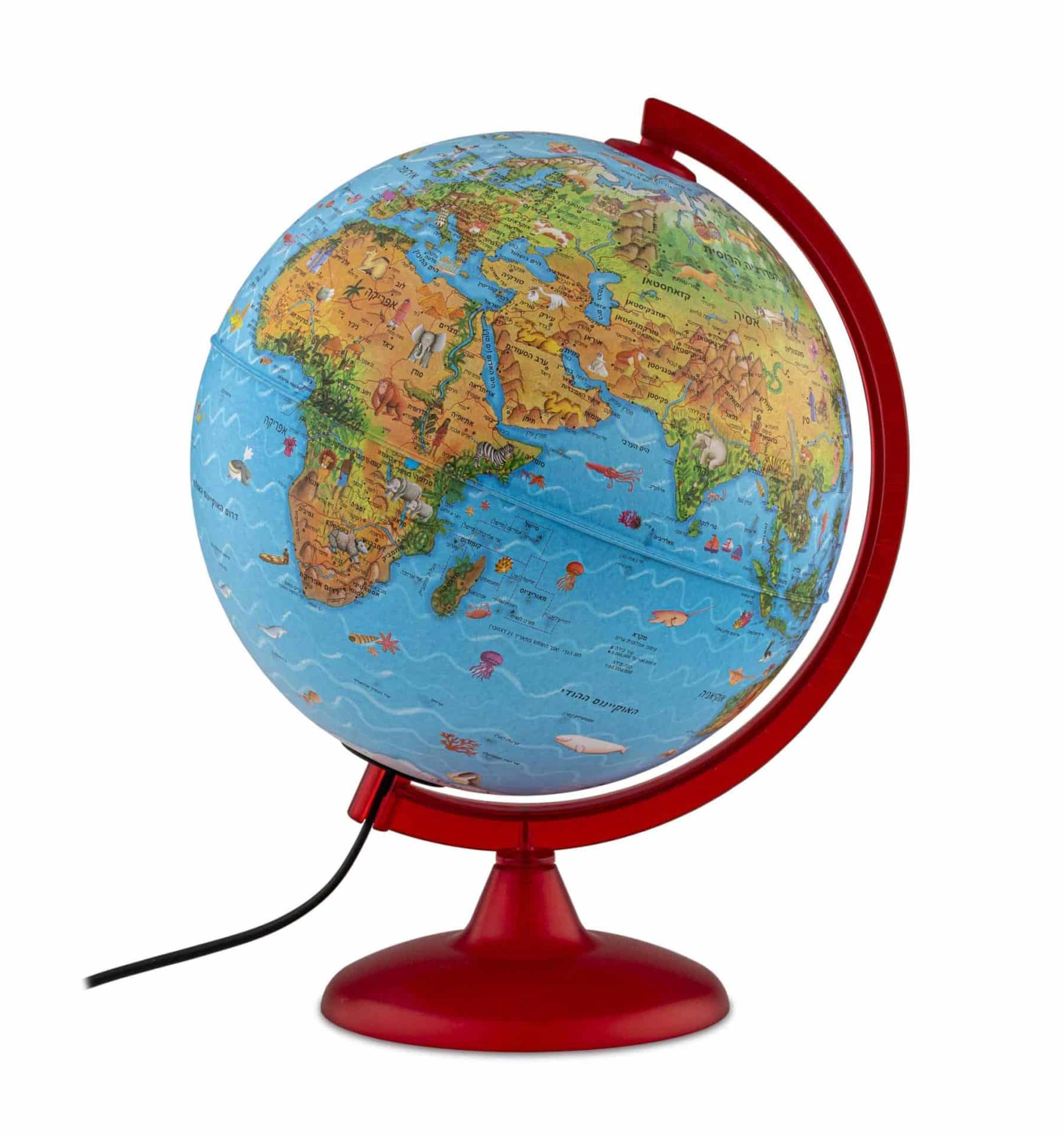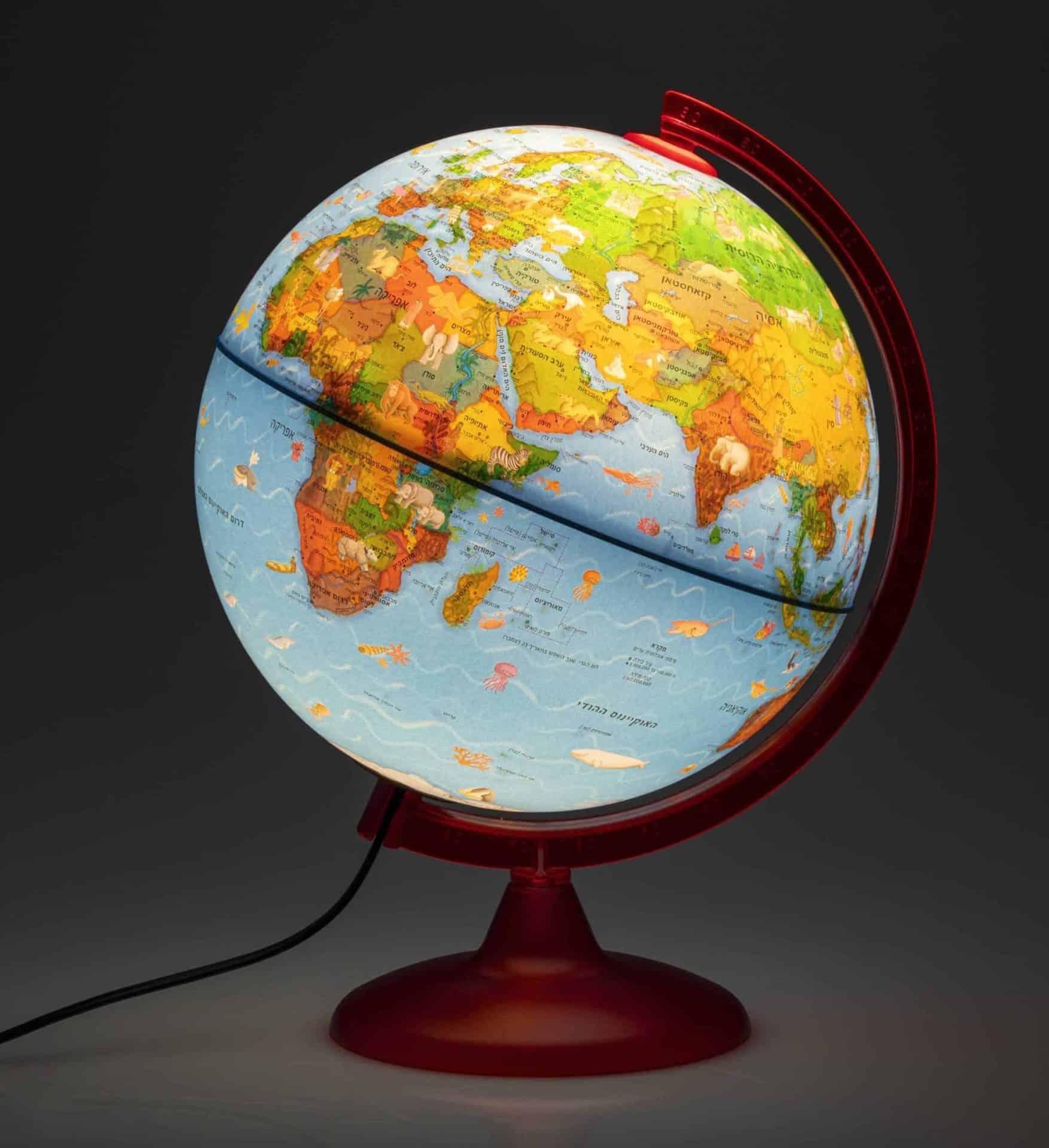 גלובוס בעברית מלאה עם תאורת לד שהופכת את הגלובוס מפיזי למדיני.