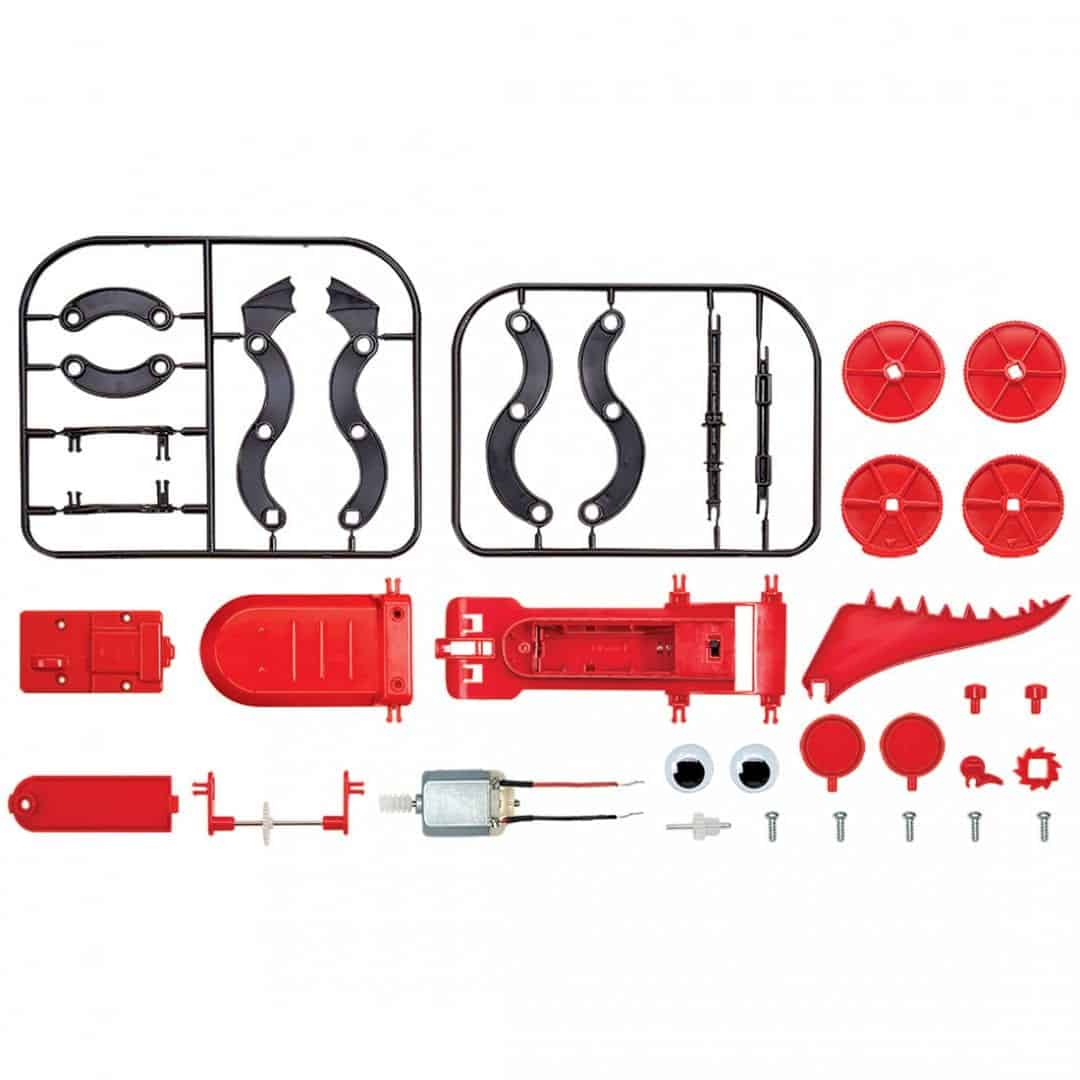 תכולה: 1 X גוף, 1 X ציר מתכתי קצר, 1 X ציר מתכתי ארוך עם ארכובות, 1 X מנוע, 1 X מכסה תבת הילוכים, 2 X מכסי הדק, 1 X מחגר משונן, 1 X רצ’ט, 1 X ציר פלסטיק ארוך, 1 X ציר פלסטיק קצר, 2 X חוליה מעוקלת עם חורים, 2 X חוליה מעוקלת עם סיכות, 2 X חוליה בצורת  S(ימין ושמאל), 2 X חוליה בצורת S עם כנף (ימין ושמאל), 1X ראש, 1 X זנב, 2 X תומך עיניים, 2 X עיניים זזות, 2 X גלגל קדמי, 2 X גלגל אחורי,  1 X מכסה תא סוללה והוראות מפורטות. (פריטים דרושים שאינם כלולים בערכה: 1 X סוללה AA V1.5, מברג פיליפס קטן וזוג מספריים).