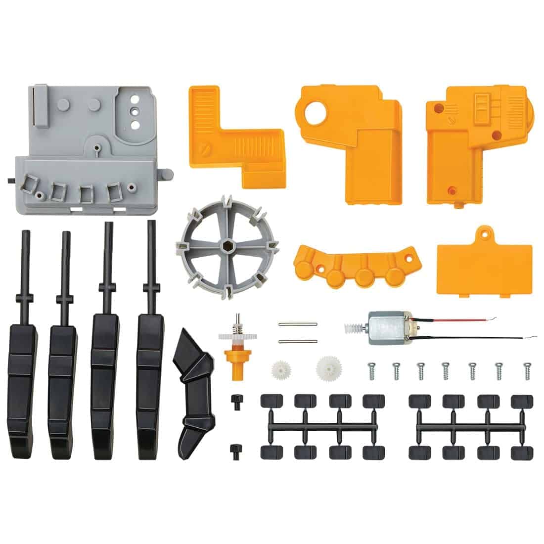 תכולה: 1x  בסיס, 1x  אגודל, 2x  אצבע עם משולש מסומן, 2x  אצבע עם ריבוע מסומן, 1x  כיסוי ציר, 1x  מצמד ציר, 1x  מנוע, 1x  כיסוי סוללה, 1x   תוף, 1x   תמיכת תוף, 1x  תבת הילוכים מצד שמאל, 1x  תבת הילוכים לצד ימין, 1x  ערכת הילוכים קטנה, 2 x מכסי הדק, 1x  ערכת הילוכים גדולה, 2x  ציר, 16x  יתד, ברגים והוראות מפורטות. דרושים אך אינם כלולים בערכה זו: מברג פיליפס קטן ו- 2 x סוללות 1.5V AAA. אורכה של היד לאחר הרכבה הוא כ-19 ס”מ.