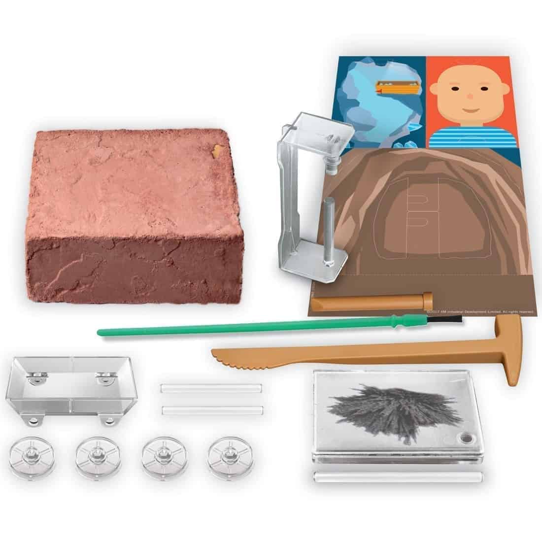 תכולה: גבס ובו טמונים מגנטים, 1 כלי חפירה, ערכת חלקים מפלסטיק והוראות מפורטות.