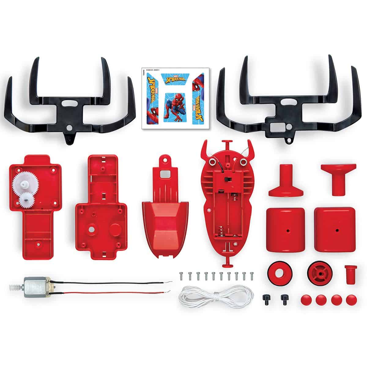 תכולה: 1x תיבת הילוכים עליונה, 1x תיבת הילוכים תחתונה, 1x תא סוללה, 1x כיסוי סוללה, 1x רגל קדמית, 1x רגל אחורית, 2x מחצית בולם זעזועים, 1x מכסה משקולת, 1x בסיס משקולת, 1x מנוע, 1x ציר, 1x גלגל עם ציר, 1x גלגל פשוט, ברגים, 2 x מכסי הדק, 4 x מכסי ציר, ו-1 x חוט. דרושים אך אינם כלולים בערכה זו: 2 x סוללות 1.5V AAA ומברג פיליפס קטן. אורכו של הרובוט לאחר הרכבה הוא 17 ס”מ.