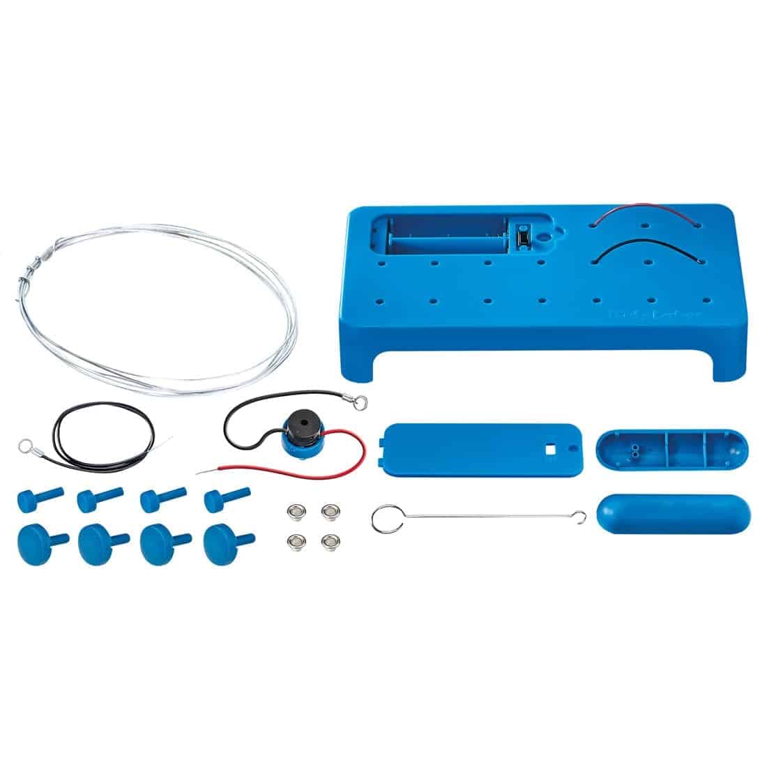 ערכת מבוך חשמלי מכילה: סט פלטפורמת זמזם מפלסטיק עם ידית, פינים, מארז סוללה, זמזם חשמלי, כבלים מבודדים והוראות מפורטות.