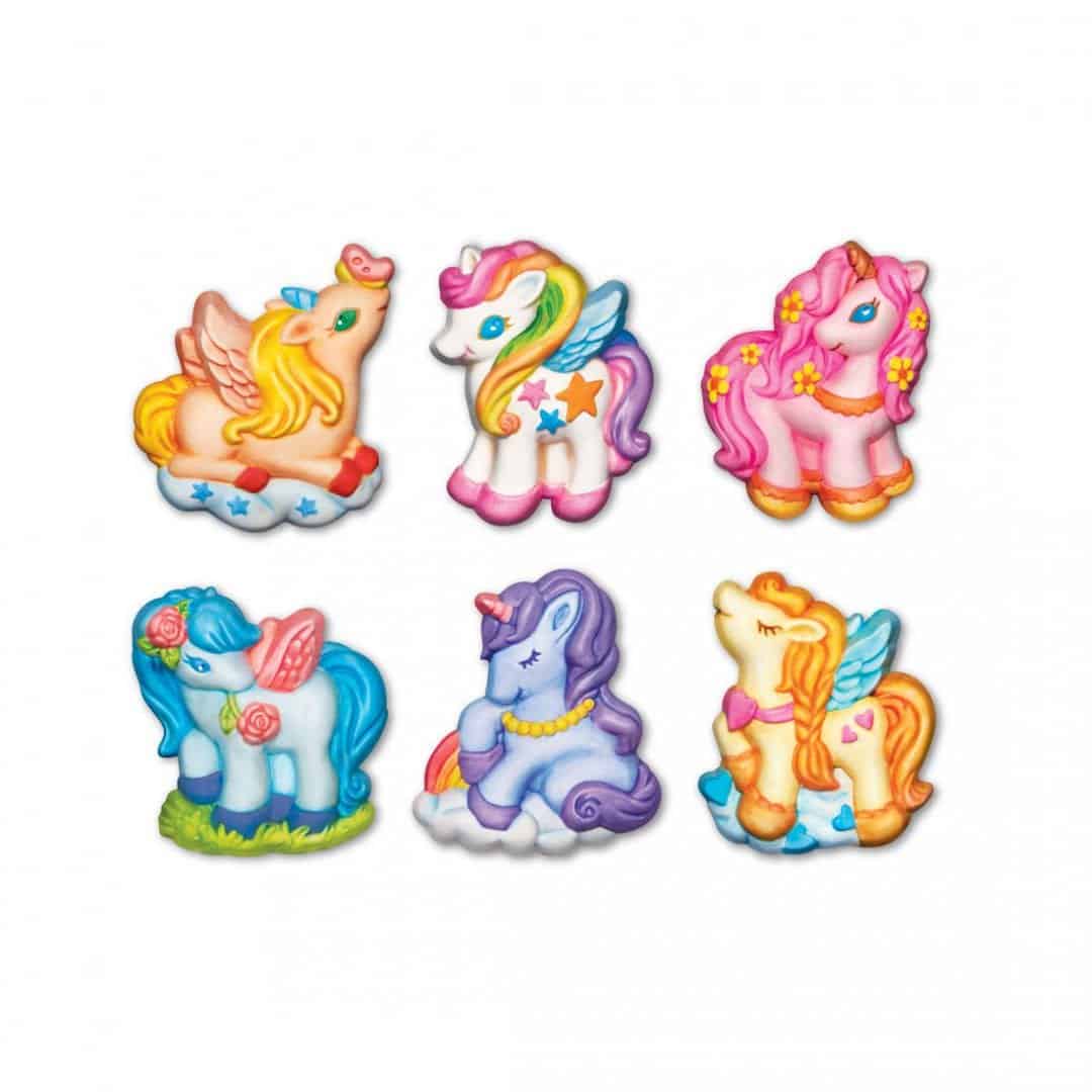 תכולה: תבנית עם 6 עיצובים, אבקת גבס, מגנטים, 2 סיכות, ערכת 5 צבעים, מכחול, נצנצים, והוראות מפורטות. התכולה מספיקה לייצור 6 חדי–קרן.