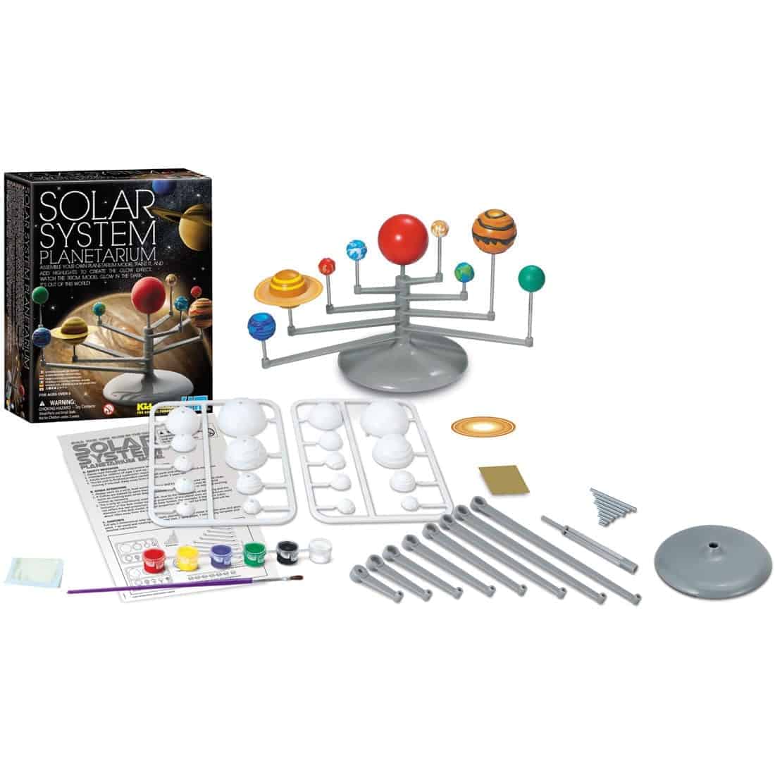 מודל פלנטריום תלת מימדי של מערכת השמש, מברשת, רצועה של צבעים וצבע זוהר, מעמד וזרועות מסתובבות, 9 מוטות פלדה, נייר זכוכית, תבנית טבעת שבתאי, הוראות מפורטות ובונוס בדמות תרשים קיר של מערכת השמש.