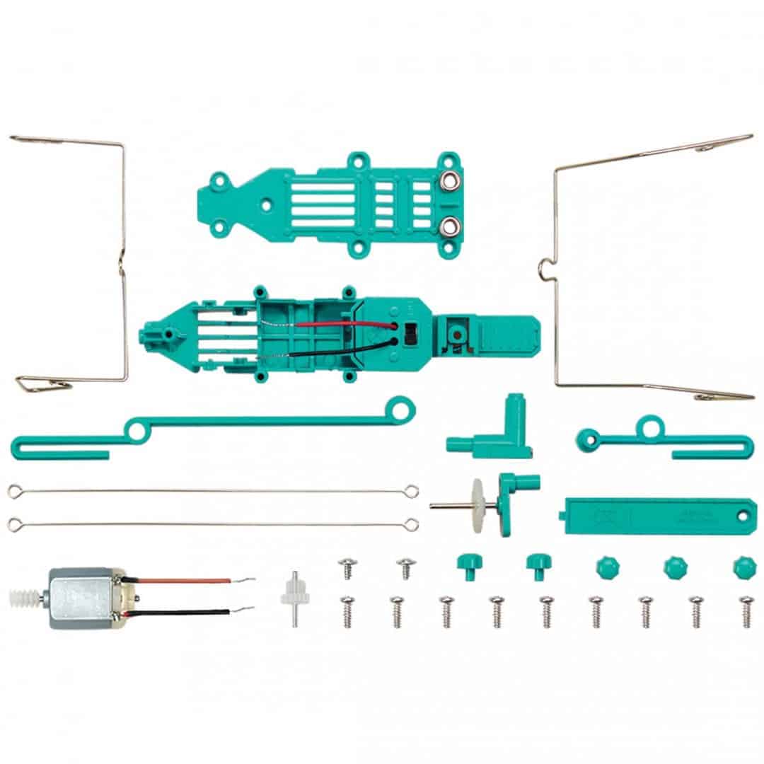 תכולה: כיסוי גוף, גוף, מחבר רגל, מנוע עם גיר, גיר גדול עם ארכובה, גיר קטן, 2 מכסי הדק, 3 מכסי מחברים, 2 ברגי דיסקית, 9 ברגים, מכסה סוללה, מחבר רגל קצרה, מחבר רגל ארוכה, 2 אנטנות, רגל קדמית, רגל אחורית והוראות מפורטות. פריטים דרושים שאינם כלולים בערכה: מברג פיליפס, וסוללת V1.5 AAA. אורכו של המוצר כ-28 ס”מ יחד עם האנטנות.