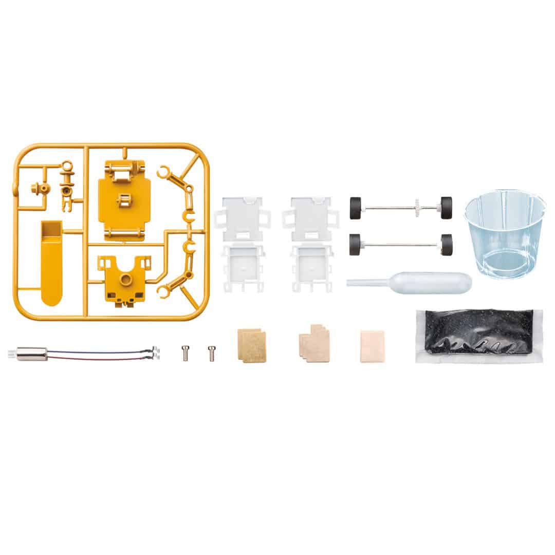ערכת רובוט מונע במים מלוחים מכילה: סט חלקים מכניים (דרושה הרכבה), 2 גליונות פחמן, 2 גליונות אלומיניום, 2 גליונות בד, מנוע עם חוטים ומגעים, טפטפת, 2 ברגים, ציר עם גלגלים, ציר עם גלגלי שיניים והוראות מפורטות.