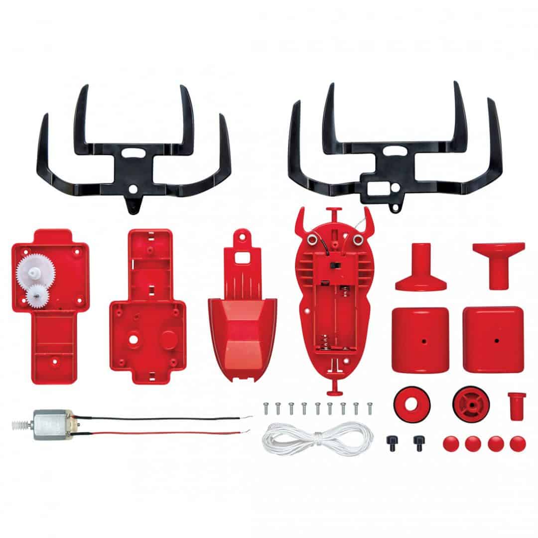 תכולה: 1x  תיבת הילוכים עליונה, 1x  תיבת הילוכים תחתונה, 1x  תא סוללה, 1x  כיסוי סוללה, 1x  רגל קדמית, 1x  רגל אחורית, 2x  מחצית בולם זעזועים, 1x  מכסה משקולת, 1x  בסיס משקולת,  1x   מנוע, 1x  ציר, 1x  גלגל עם ציר, 1x גלגל פשוט, ברגים, 2 x מכסי הדק, 4 x מכסי ציר, ו-1 x חוט.  דרושים אך אינם כלולים בערכה זו: 2 x סוללות 1.5V AAA ומברג פיליפס קטן. אורכו של הרובוט לאחר הרכבה הוא 17 ס”מ.