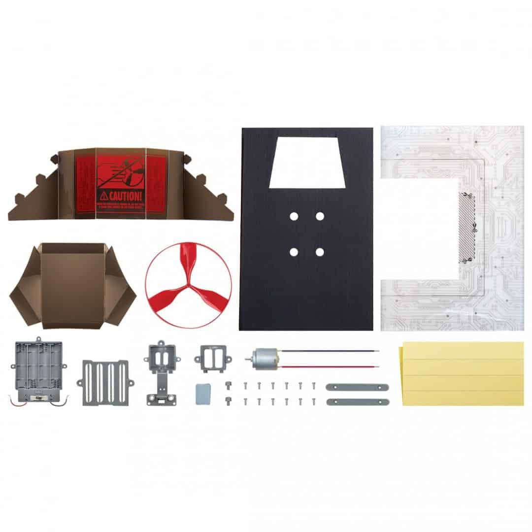 תכולה: לוח בסיס, חצאית פלסטיק, תבנית קשת, תבנית צינור, תא סוללה עם מפסק וחוטים, מכסה תא סוללה, מעמד מנוע, מכסה מנוע, 2 X מוט חיבור, מדחף, נייר דבק דו-צידי, מנוע עם חוטים, ברגים, דבק לשימוש חוזר, 2 X מכסי הדק והוראות מפורטות. אורכו של המוצר לאחר הרכבתו הוא כ-33 ס”מ. (פריטים דרושים שאינם כלולים בערכה: 4 X סוללות AAA V1.5 ומברג פיליפס קטן).