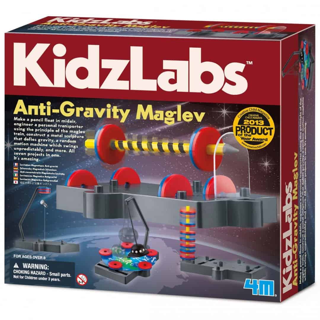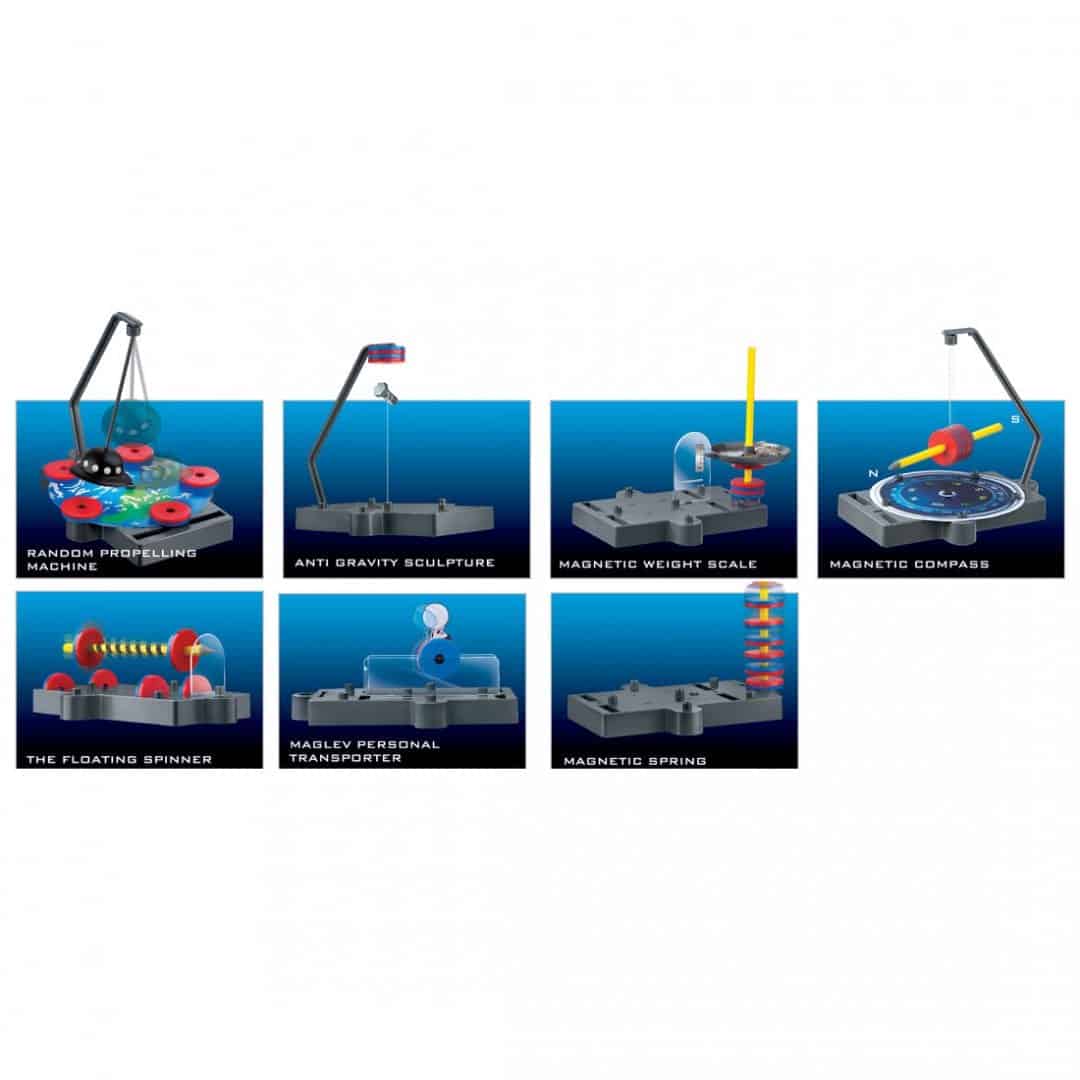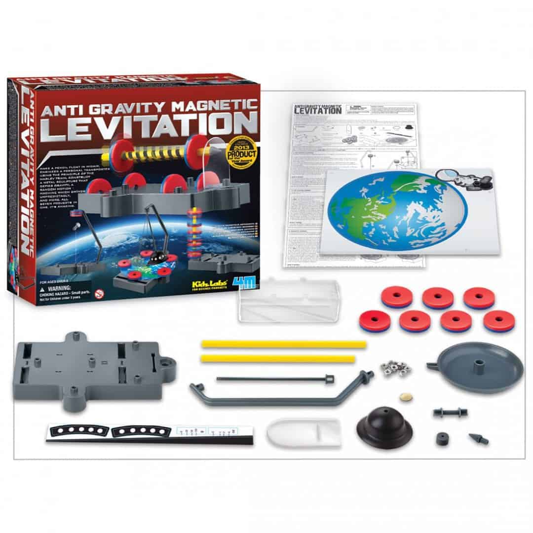 ערכת ריחוף מגנטי אנטי גרביטציוני מכילה: גוף עב”ם, חוט, תצריף חוט, ציר, 10 אומים, מחיצה, אגן מדידת משקל, זרוע תמיכה, מדבקה, דסקית נחושת, סמן, מוט דק עם טבעת. תבנית מאוירת (מצפן, כדור הארץ, איש חלל), תיבה מגודרת, 7 מגנטי טבעת, מוט מעוגל, מוט מחומש, לוח בסיס והוראות מפורטות. (נייר דבק דרוש אך לא כלול)