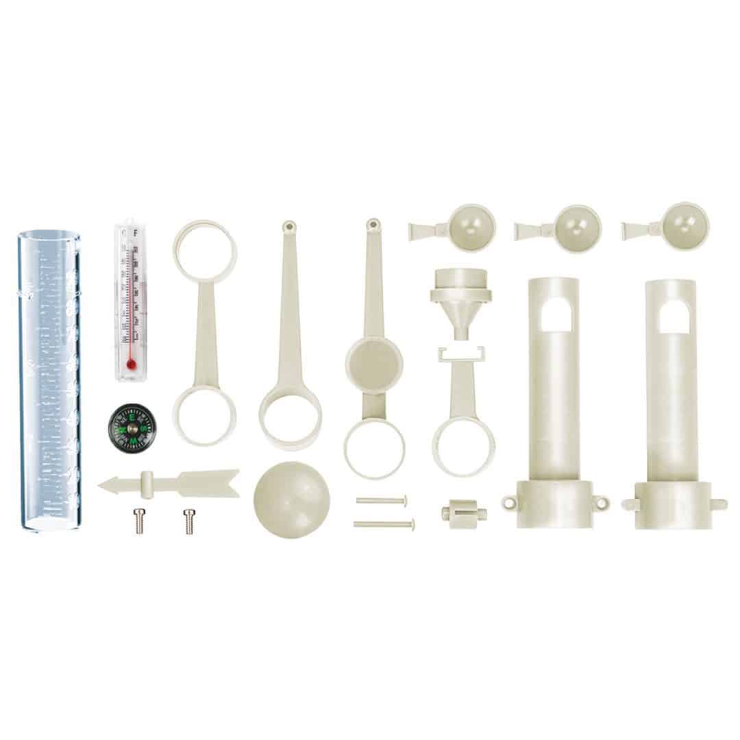 ערכת תחנה מטאורולוגית מכילה: צינור פלסטיק, מד-חום, 2 חצאים עמודת תמיכה, משפך, זרוע תמיכה במד גשם, זרוע תמיכה בשבשבת, זרוע תמיכה במד-רוח, זרוע תמיכה במד- חום, מצפן, שבשבת, כוסות מד-רוח, פלך קצר, פלך ארוך, פקק, טבור שבשבת, ברגים והוראות מפורטות. המרכיבים מספיקים ליצירת תחנת חיזוי מזג אוויר במימדים של 22 ס”מ / 12 ס”מ.